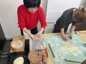 希望者には餃子の皮づくりから体験していただき、みなさんで包んだ熱々の水餃子を振る舞いました。出来立ての餃子に「おいしい!」という声も多く、とても好評でした。